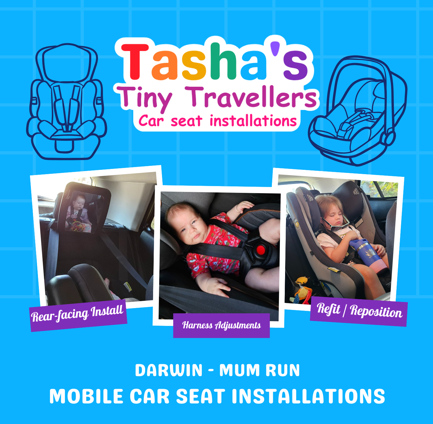 Mobile ACRI-accredited child restraint installation service providing professional car seat fitting, checks, and education for parents and carers. Services include installation, refits, harness adjustments, newborn and hospital-discharge checks, and vehicle compatibility assessments. All work is completed in accordance with Australian Standards and manufacturer guidelines.